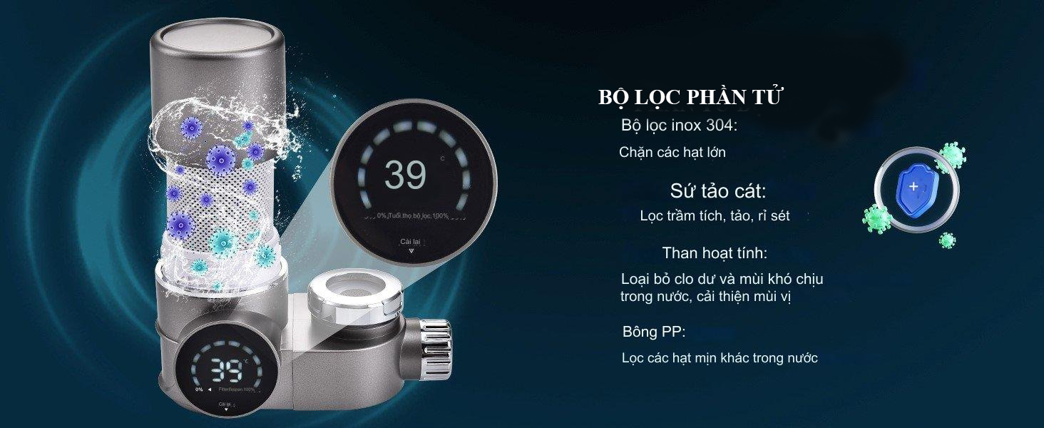 Bộ lọc tại vòi có thể giảm lượng clo còn lại và loại bỏ cát và sinh vật phù du khỏi nước. Lớp lọc làm bằng vải không dệt loại bỏ cặn và các hạt lớn. Vật liệu FOF ngăn ngừa hiệu quả sự tích tụ cặn vôi bằng cách lọc các hạt lơ lửng nhỏ