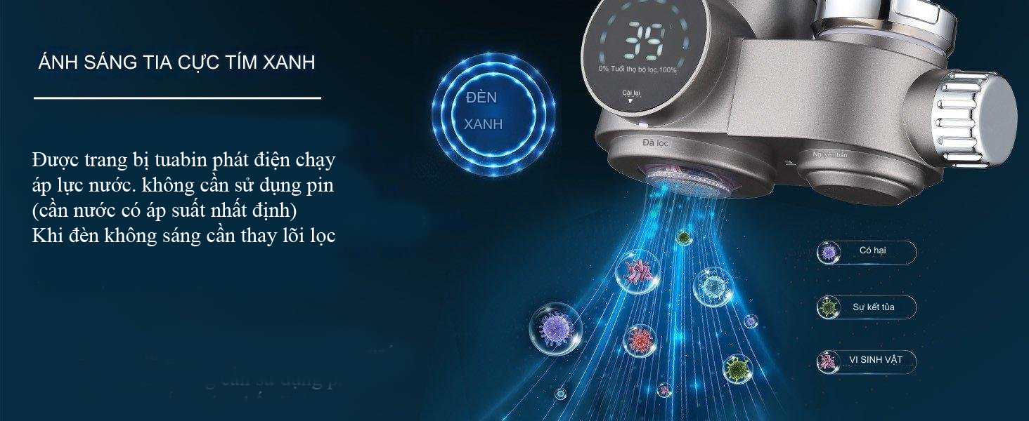 Công nghệ ánh sáng xanh UV cải tiến: Được trang bị ánh sáng xanh UV để tăng cường khả năng lọc nước. Cảm biến từ trường tuabin độc đáo tạo ra động năng thông qua dòng nước mà không cần pin. Sự kết hợp giữa công nghệ tiên tiến và thiết kế tinh tế(Thích hợp với Phạm vi áp suất nước: 0,1Mpa-0,4Mpa)